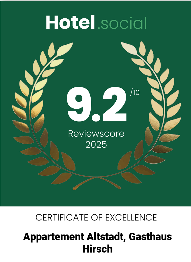 Auf Grundlage bester Bewertungen hat "booking.com" und "Hotel.social" die eindrucksvolle Punktzahl von 9.2 verliehen. Mit diesem Zertifikat erhält der "Hirsch" den „preferred“-Status.